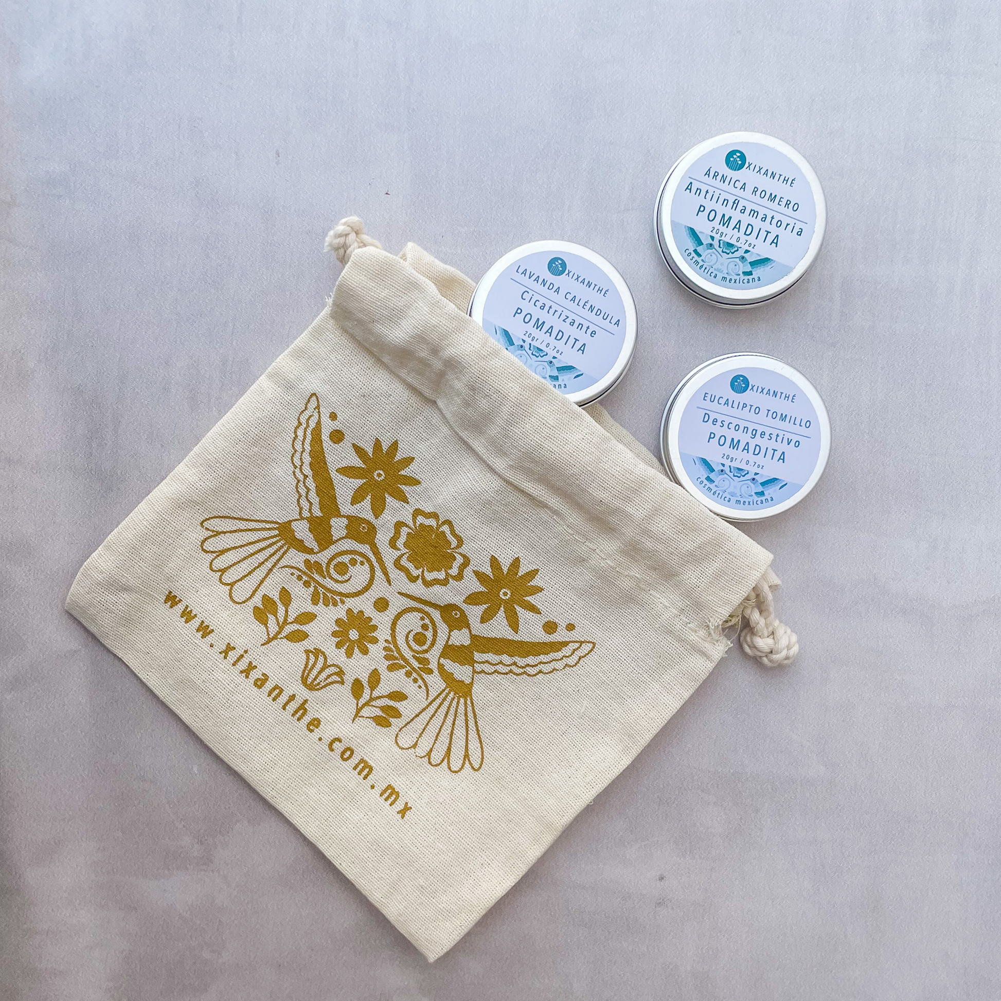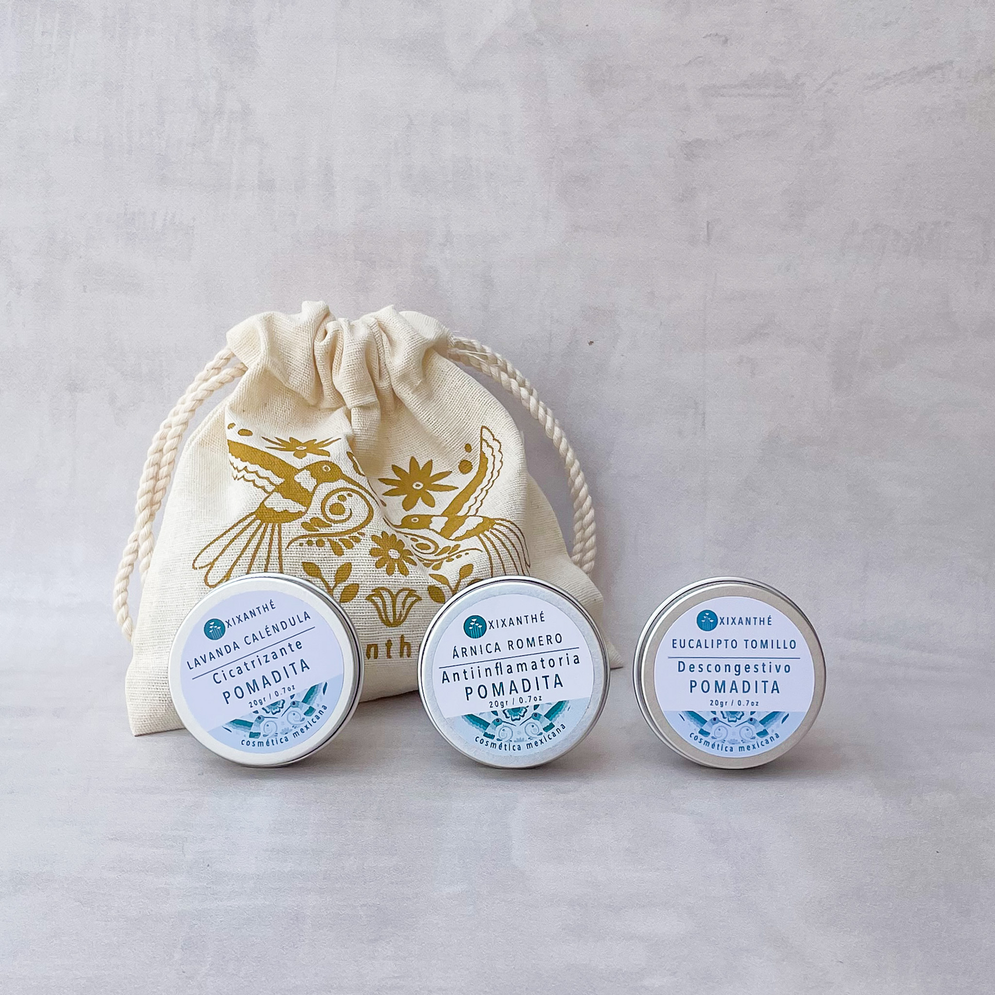 Kit de 3 pomaditas en tamaño pequeño para que siempre tengas tu botiquín natural contigo.